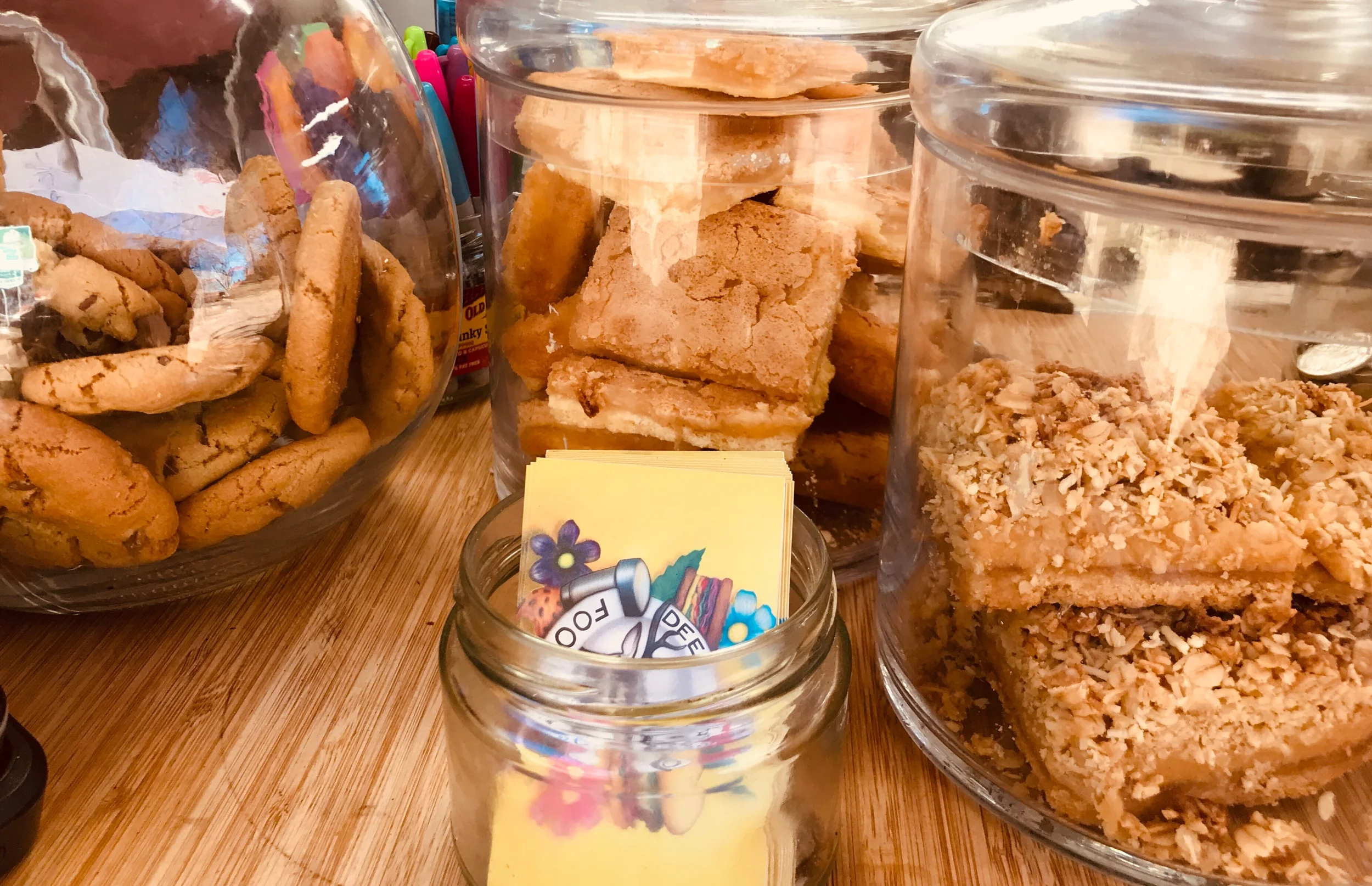 Food sizzles away and mouth-watering homemade slices and cookies await. Bacon and egg rolls, toasties, burgers, steak sambos, hot chips and spiced chickpea burgers are passed through the windows to hungry travellers.