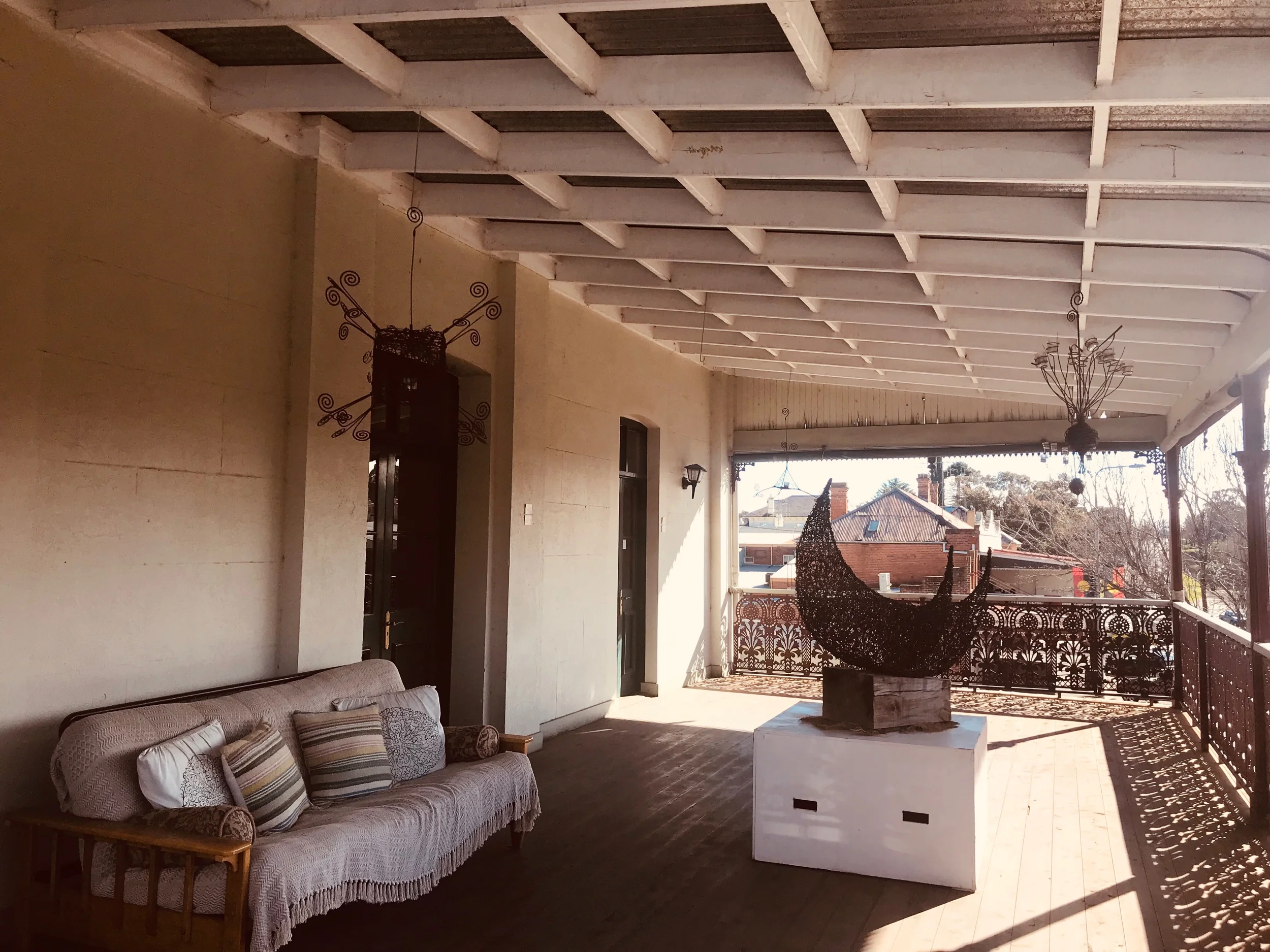 Double doors lead out to a huge balcony with wrought iron trimming over the main street. Large windows allow natural light to spill over the beautifully styled shelves and tables inside, making the old hall feel cosy even on a Wintery day.